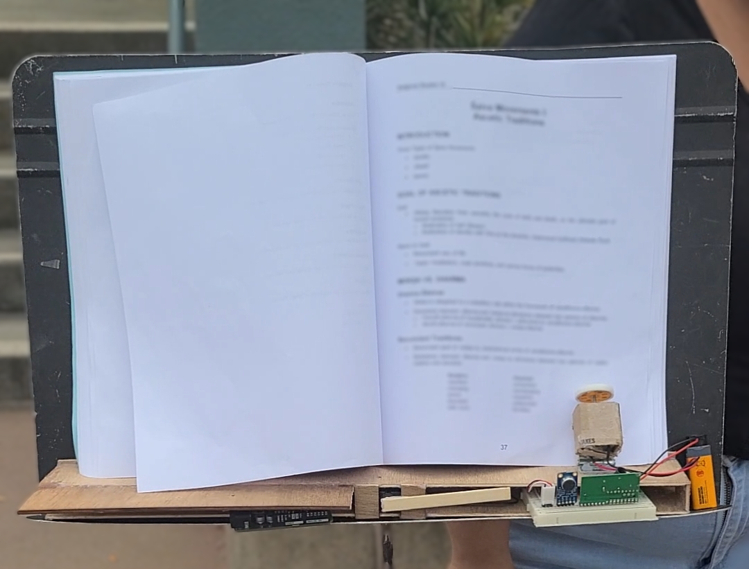 Our 5 person group designed an automatic page-turner for flipping through sheet music on a music stand. The group was split into two teams, with one team of three focusing on the physical device and a team of two focusing on finding a possible method to use sound as the trigger to turn a page. LaiLa was a part of the physical device team and focused mainly on the body of the device, which held the page-turning component and held up the sheet music.
