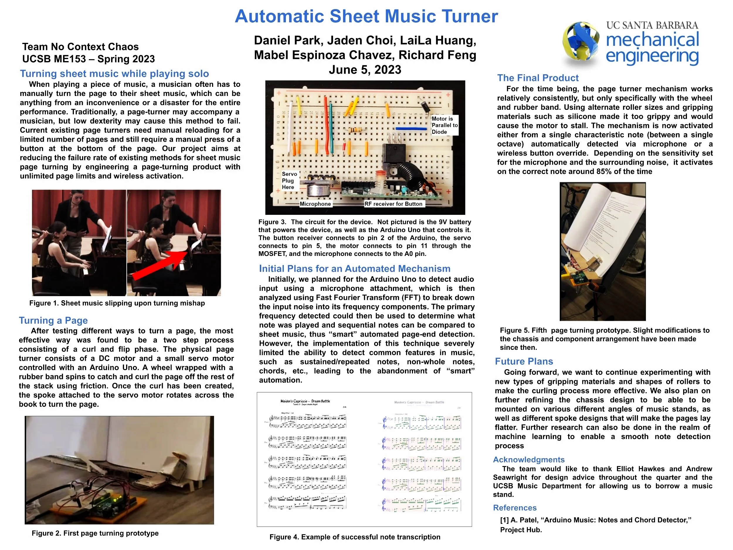 A group project for UCSB’s quarter-long ME153 Introduction to Mechanical Engineering class, we were tasked with coming up with a problem and engineering a solution for it. The problem that our group came up with was page turning when playing an instrument.