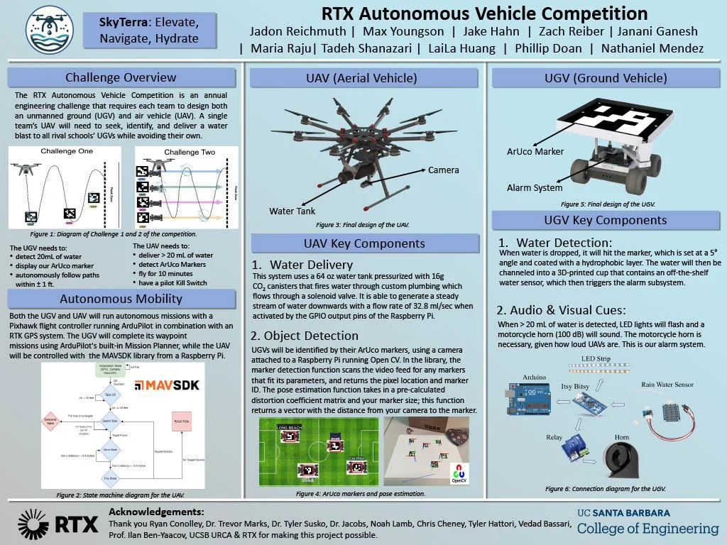 The Raytheon Autonomous Vehicle Competition is a competition between universities sponsored by Raytheon. The premise of the competition is for each team to build both an unmanned aerial vehicle and an unmanned ground vehicle that can complete certain tasks through multiple trials. In all the trials, each university’s UAV goes one at a time to find the other competitors’ UGVs placed randomly on a field and deliver a water payload. The UGV must detect and give both a visual, and audio indication of the water payload if hit. Subsequent trials have the UGV moving in increasingly complicated patterns, such as a straight line, zigzag, and crossing paths with other UGVs. All of this must be done autonomously with no human input other than starting the vehicles.